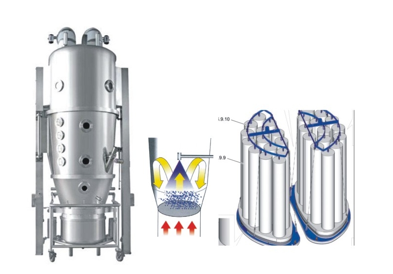 需要制粒的單一或多種粉體原料在沸騰床內(nèi)建立流態(tài)化過程,同時混合,粘結(jié)劑經(jīng)特制噴槍霧化噴至流化界面,物料凝聚成粒并干燥,揮發(fā)水份由風(fēng)機排出。集混合、制粒、干燥多功能于一體,自動化程度高,能快速制粒,快速干燥。